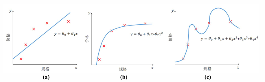 - (a) 欠拟合 (Underfitting): 模型过于简单,无法捕捉数据的基本规律。例如用直线去拟合非线性的数据。