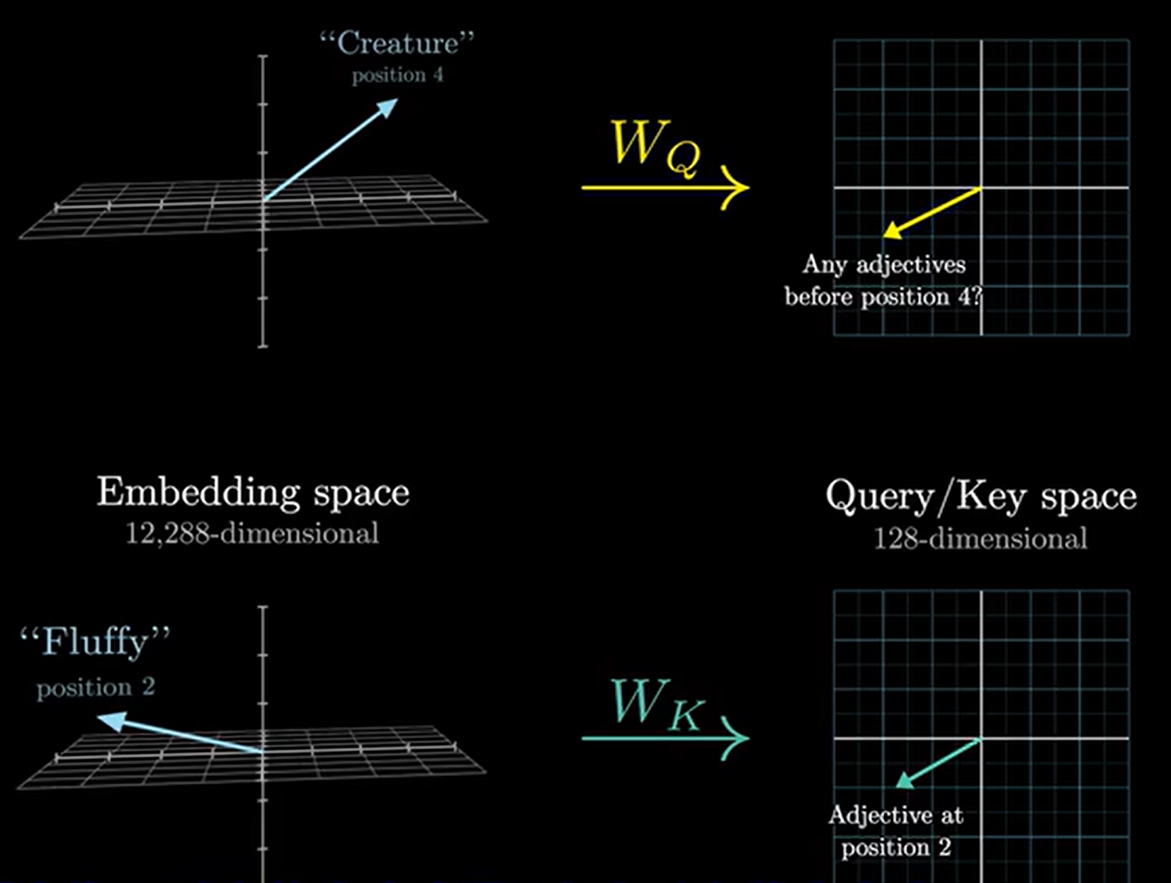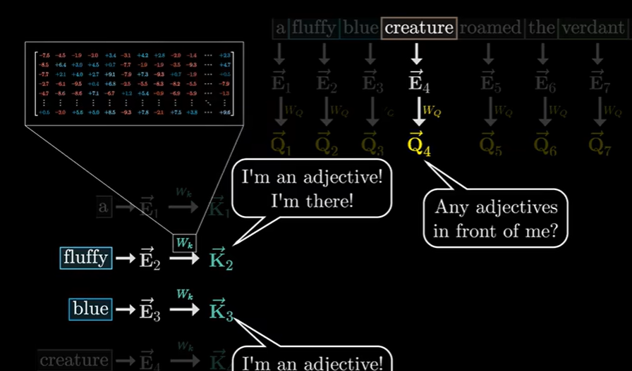 我们由Embedding后的向量得到Query,方法是乘上一个 \(W_Q\) , 如下图。其中\(W_Q\) 是模型参数,是从数据中学习得到的,其机制可以大概理解为:当embedding后的creature是名词,就映射到“寻找形容词”的Query上。