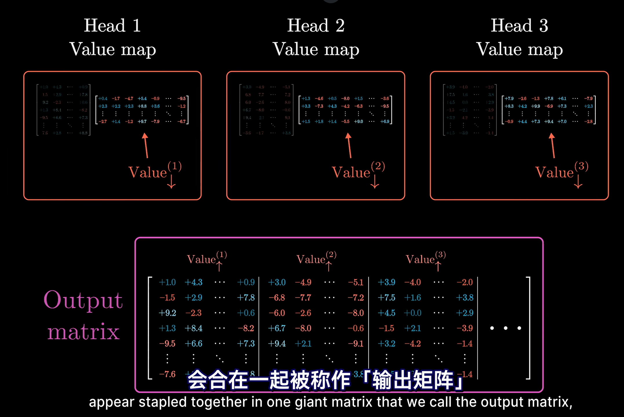在实际实现中 \(\text{Value}_{\uparrow}\) 矩阵会被合起来被称作 输出矩阵,而 只有这里的 \(\text{Value}_{\downarrow}\) 才会被称作 单个注意力头的值矩阵