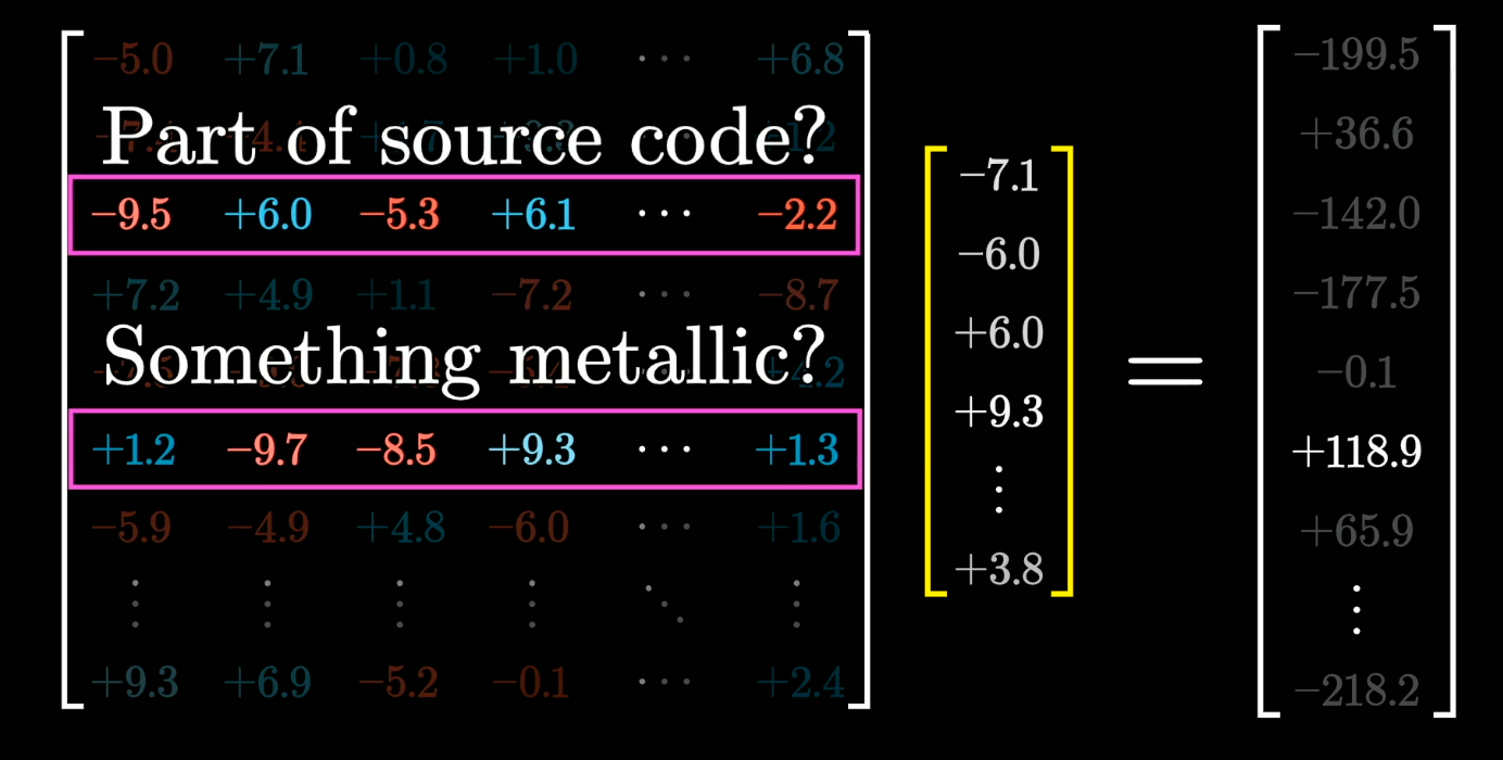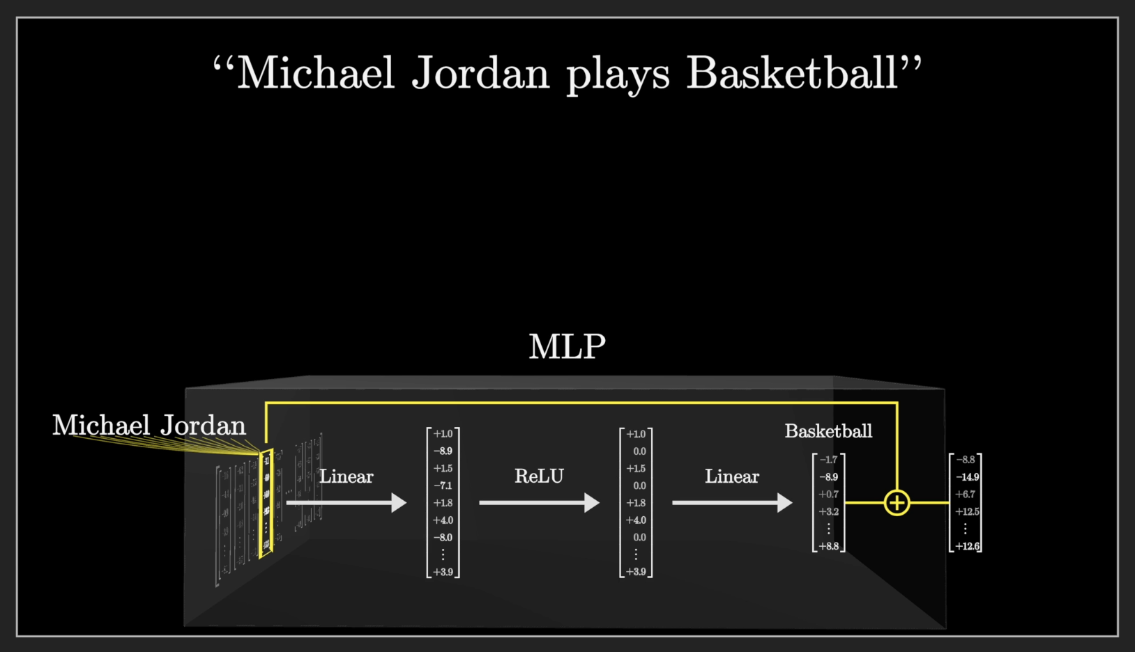 MLP是非线性的,Attention模块内部实质上还是矩阵相乘、线性变换。其实这个MLP模块也可以理解为MLP增加了表达能力,但3B1B还是做了进一步解释: