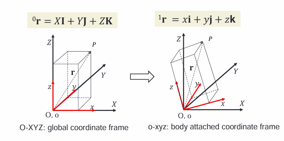 - 在世界坐标系 O-XYZ 中: \(^0\mathbf{r} = X\mathbf{I} + Y\mathbf{J} + Z\mathbf{K}\)