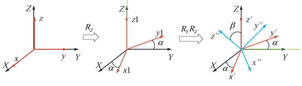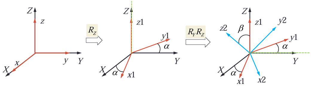 - Step1: 绕 Z 轴旋转 \(\alpha\) (Precession/进动)