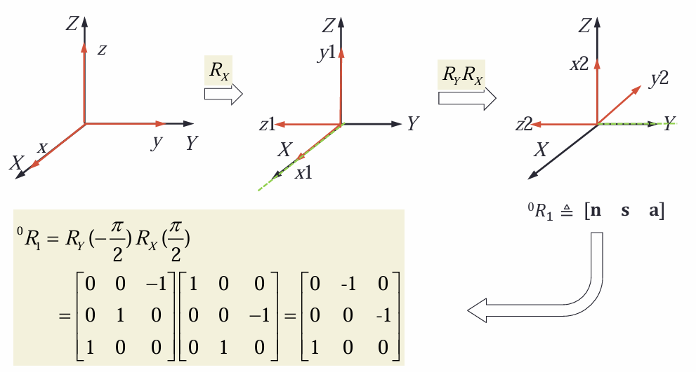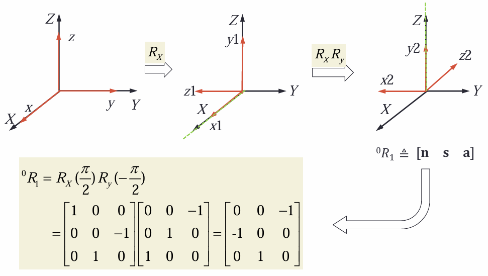 ^0R_1 \triangleq [\mathbf{n} \ \mathbf{s} \ \mathbf{a}] = \begin{bmatrix}