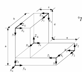 ^0T_1 = \begin{bmatrix} -1 & 0 & 0 & 0 \ 0 & 0 & -1 & e+c \ 0 & -1 & 0 & a-d \ 0 & 0 & 0 & 1 \end{bmatrix}