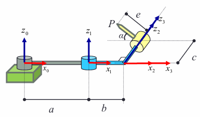 非标准DH方法的一个优点是旋转 \(\theta_i\) 是围绕 \(z\) 轴进行的,并且关节编号与坐标编号相同。 - 缺点: