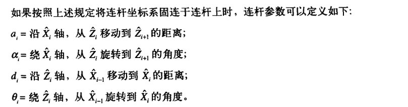 - \(\alpha_{i-1}\) 是绕 \(x_{i-1}\) 轴从 \(z_{i-1}\) 轴到 \(z_i\) 轴的角度。
