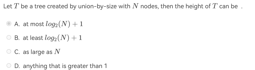 union-by-size构造出来的,总是将规模小的树合并到大的上,共\(N\)个节点,那么\(height(T)\leq \lfloor \log_2 N+1 \rfloor\)