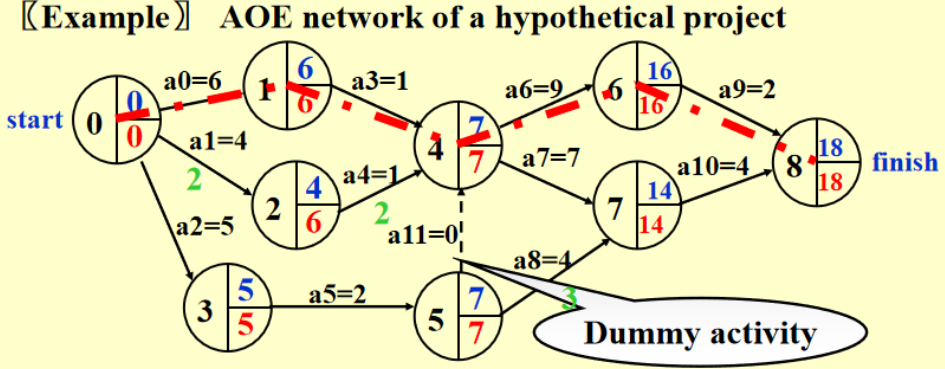 - 关键路径(critical path):所有边的空闲时间均为0的路径