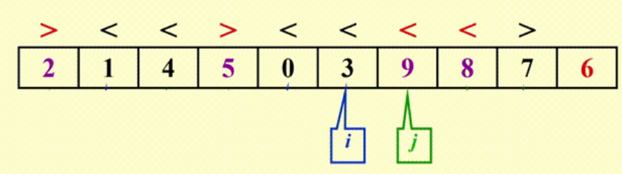 最后i>j之后,交换最后一个元素和i。(此时j在3的位置,i在9的位置)