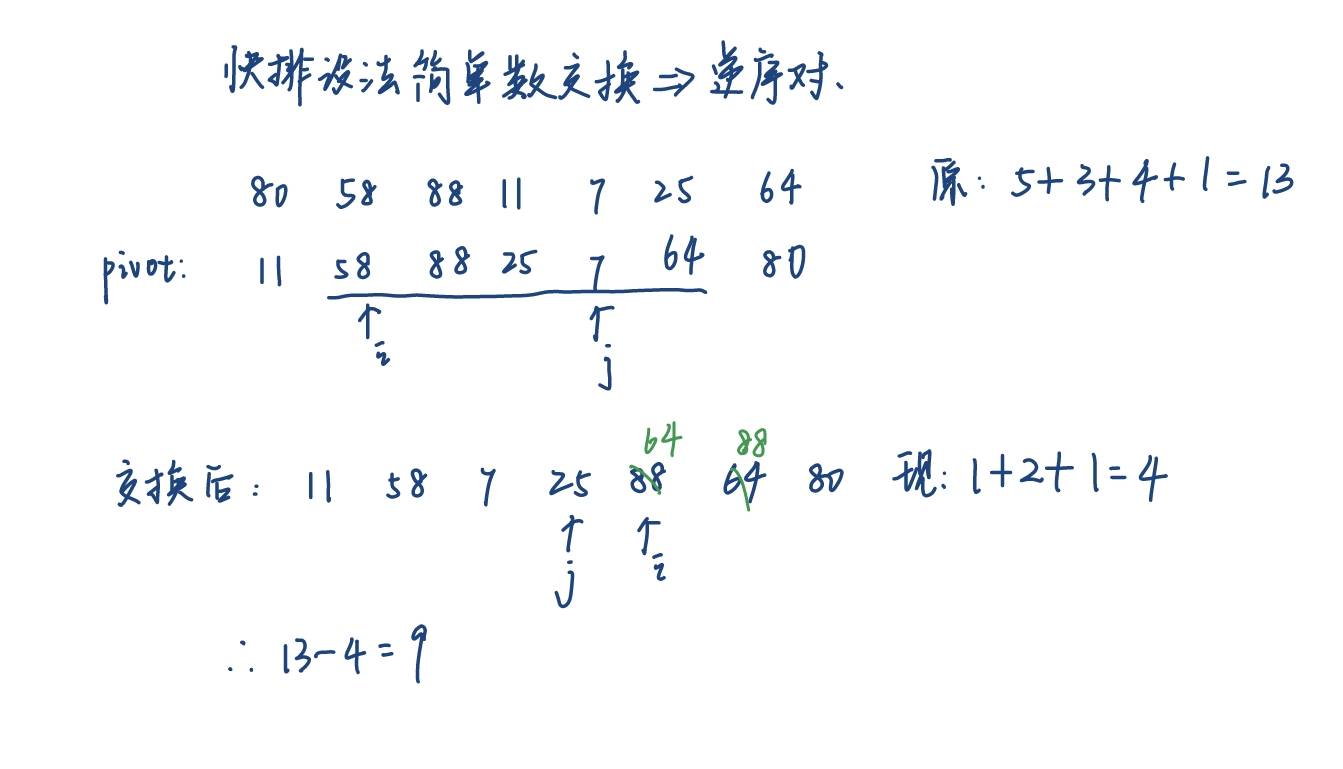 {80, 58, 88, 11, 7, 25, 64}in ascending order by Quick Sort, the pivot is selected by Median-of-Three Partitioning. After the first run, the number of inversions will decrease by ___.
