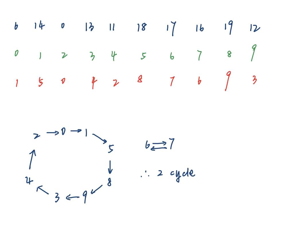 list[10] = {6, 14, 0, 13, 11, 18, 17, 16, 19, 12}by Table Sort, the resulting index permutation arraytable[10]is made up of ___ disjoint cycles.