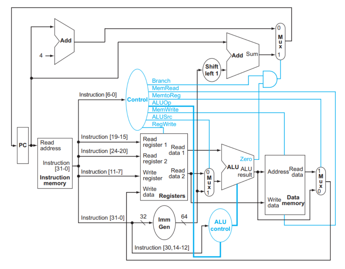 I[31:0],也就是整个指令;它被传给 Imm Gen 模块,将指令中的立即数符号扩展到 64 位;然后在 (3) 处左移 1 位,再与 PC 相加。
