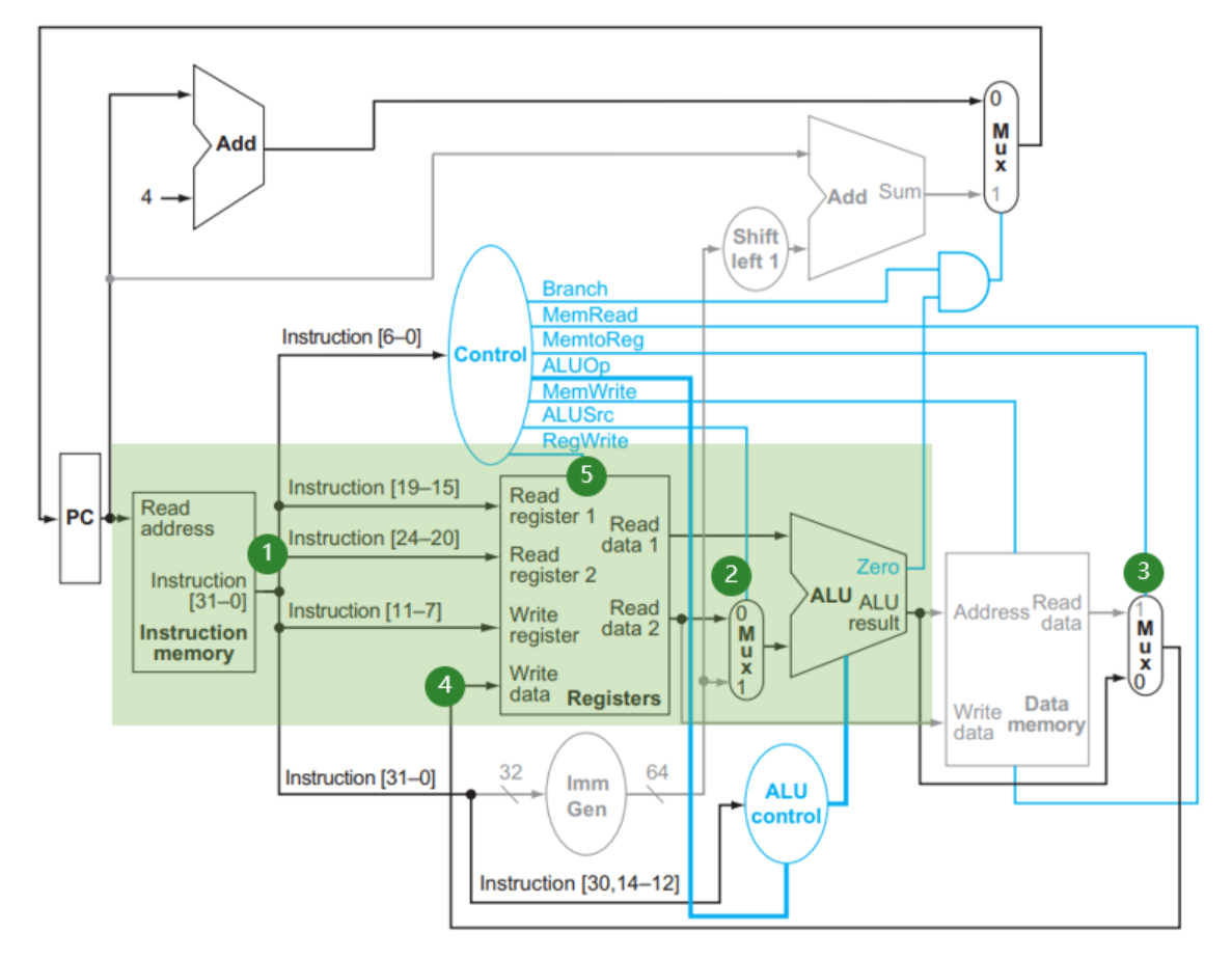 [6:0](funct7)被送到 Control 产生对应的控制信号,我们稍后可以看到;[19:15],[24:20],[11:7]分别对应rs1,rs2,rd,被连入 Registers 这个结构,对应地Read data 1和Read data 2两处的值即变为rs1,rs2的值; - (2) 处 MUX 在