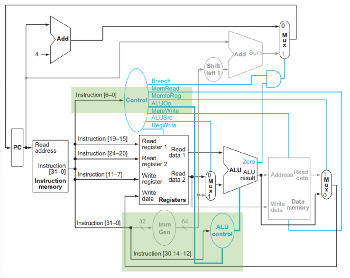 ALUSrc = 0的信号作用下选择Read data 2作为 ALU 的输入与Read data 1进行运算,具体的运算由ALU control提供的信号指明(我们在 4.1.3 小节 讨论这个话题)。运算结果在ALU result中。