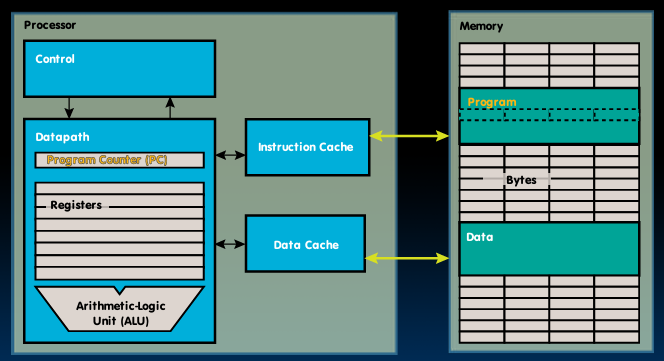- 在处理器芯片上有一些内存块,包含了从主内存复制的指令副本和数据副本,并有两种独立的方式访问他们,就不必争夺主内存。
