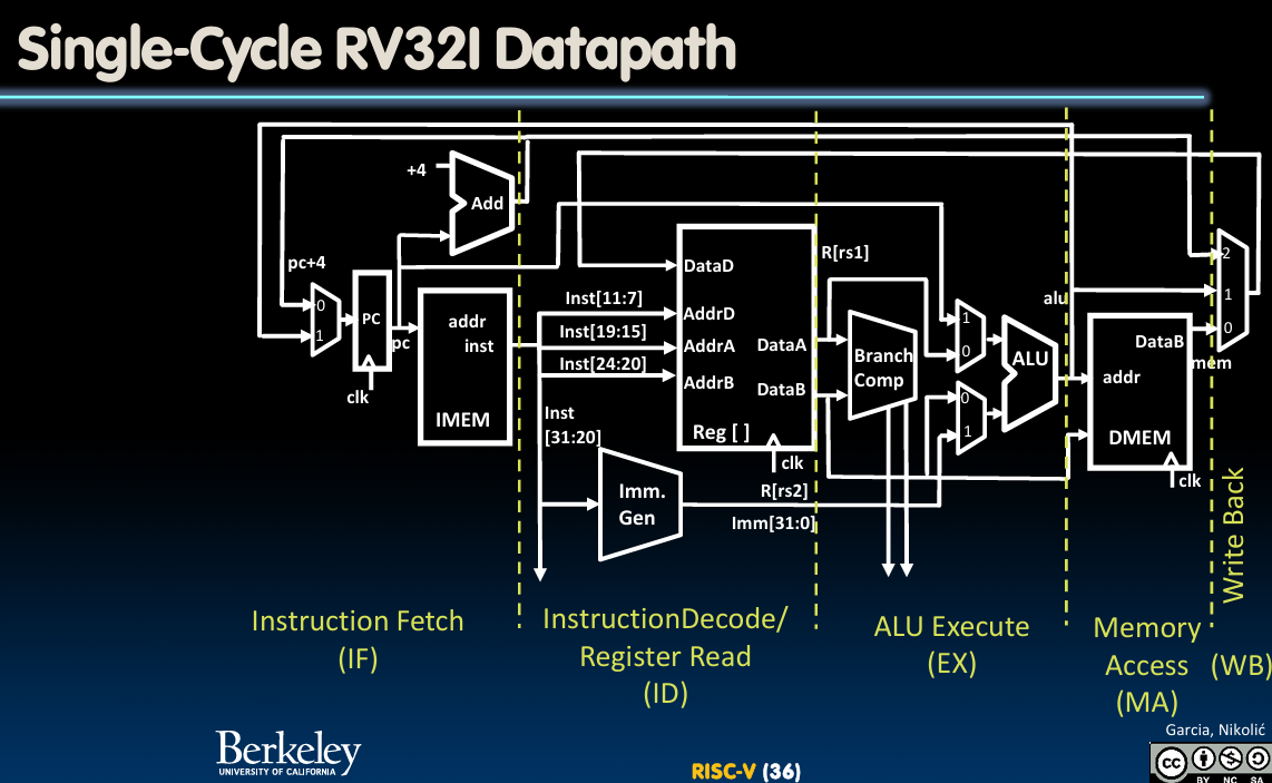 这是一张 RISC-V 核心指令的实现图(并不完整),之后我们会用这张图进行分析。