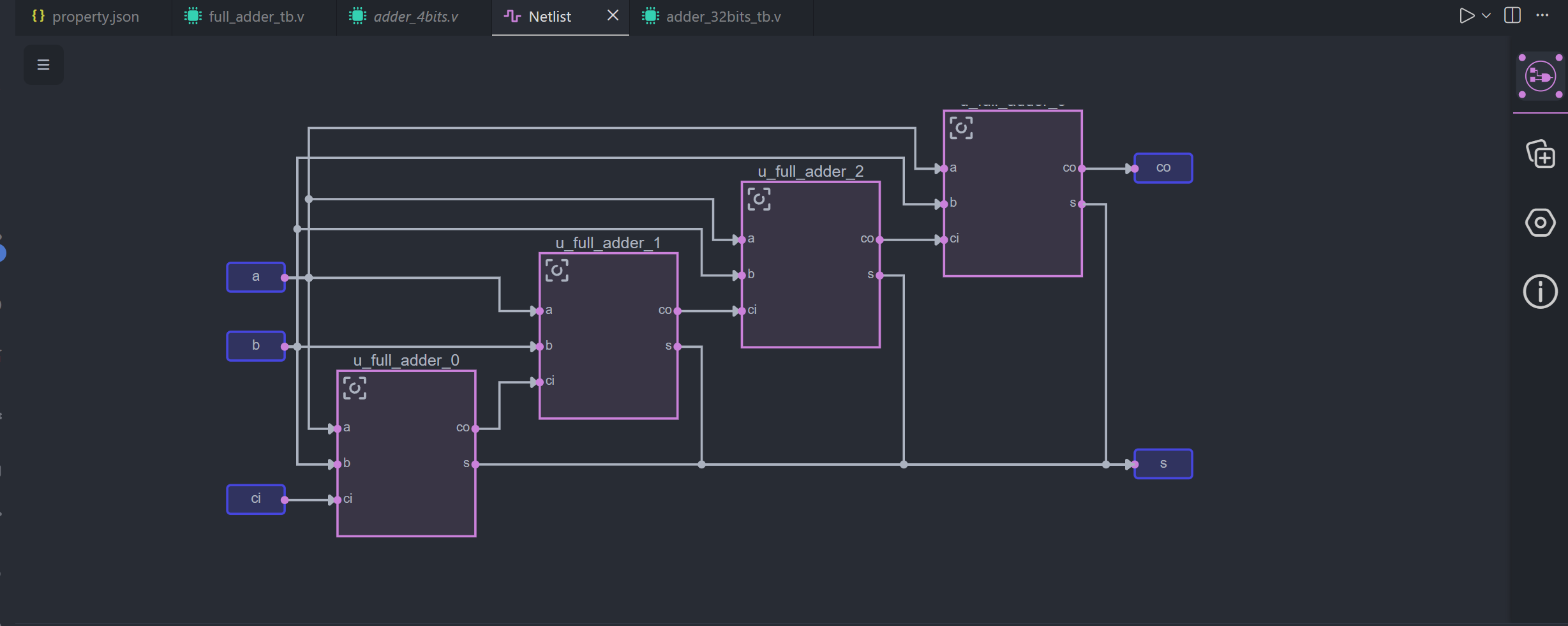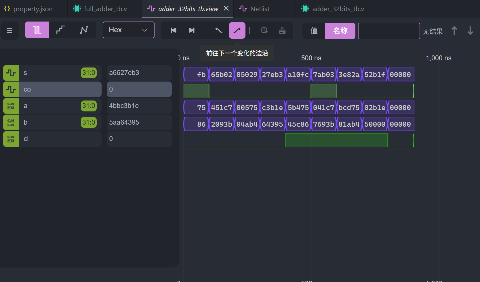 此外,Netlist和仿真的效果也还不错,虽然依赖于三方的iverilog。对于笔者这样的菜鸟来说,相比于信电实验课提供的超卡并且License经常过期的Modelsim,笔者在折腾了半天iverilog之后使用digital IDE有了非常棒的仿真体验,32位全加器的波形几乎是立刻生成的,至少在写写小工程的时候已经很不错了。