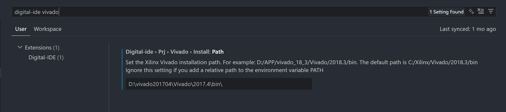 - vscode settings -> 搜索栏搜索digital-ide vivado,将刚刚得到的路径复制进来